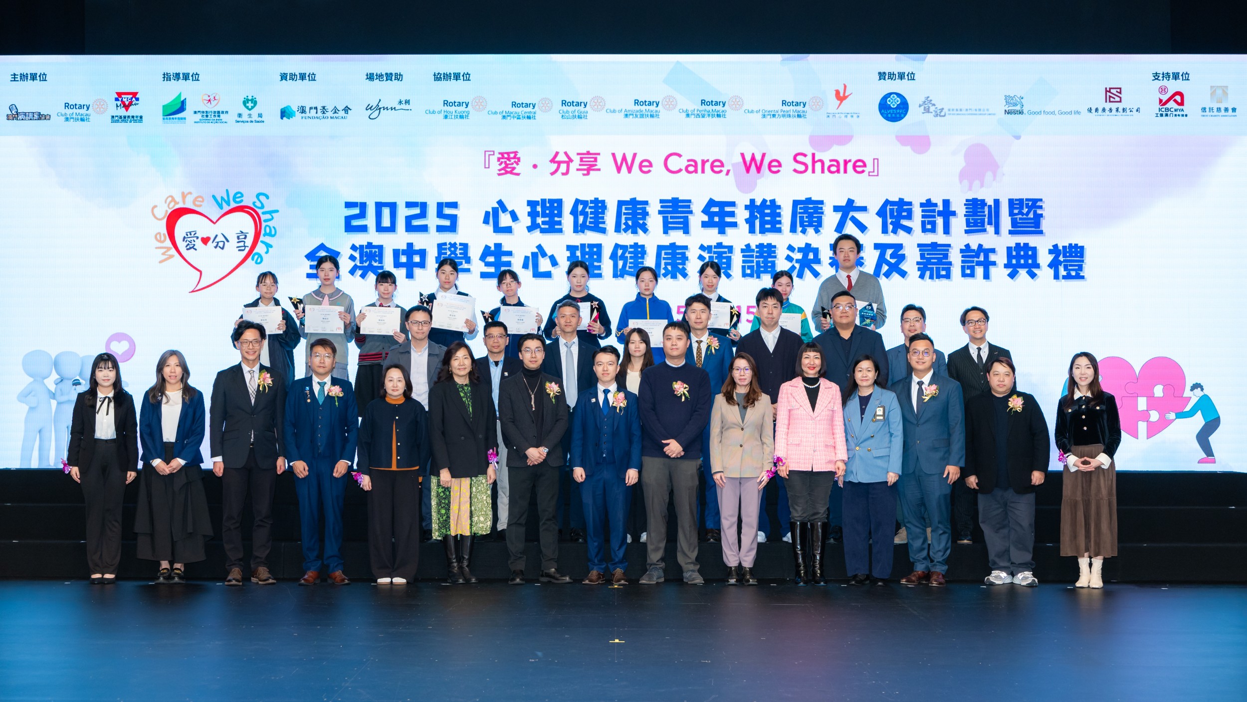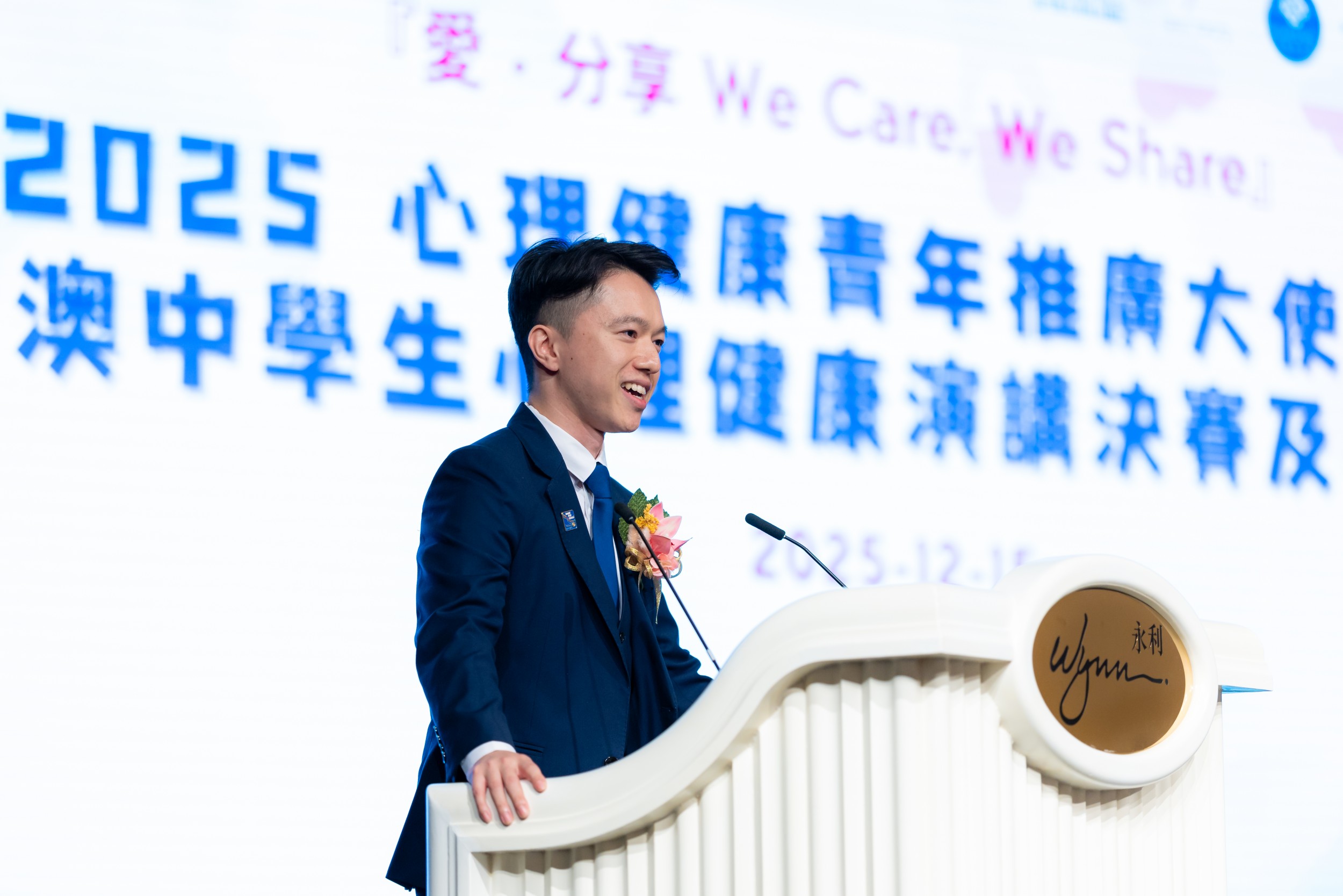 16/12/2025第三屆「愛.分享 We Care, We Share」心理健康青年推廣大使計劃暨全澳中學生心理健康演講比賽總決賽及嘉許典禮,於永利澳門宴會廳圓滿舉行。活動吸引近200名來自全澳學校、社團及公眾人士參與,場面熱烈。